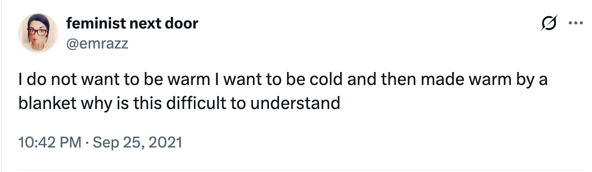 It’s just so that it’s better - so much better, it just is - and it’s really hard pretending it isn’t to the pro-summer propagandists with whom I don’t feel like arguing.